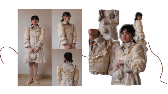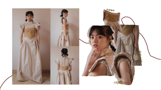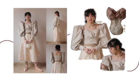 面料采用素色帆布面料作为主面料,将视觉集中在廓形上,皮革、浮雕提花面料以及刺绣欧根纱面料作为辅助面料。辅料上使用珍珠缘饰及缎带,增加服装华美感。将杏色作为主色调,采用同类色配色方案贴合“春日”自然柔和,温暖精致的视觉感受。