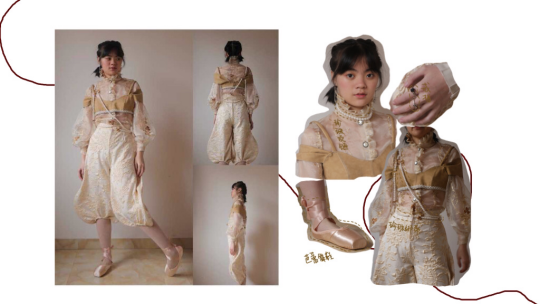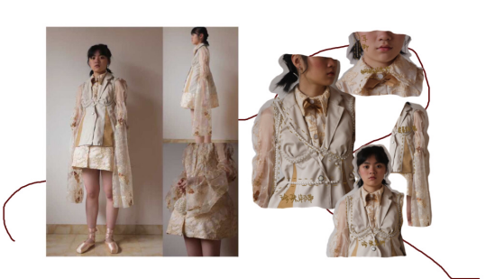 我的主题名为春日,意在描绘春天自然浪漫的视觉感受,花朵、光影、树木,贴合洛可可风格的细腻柔美的同时将宫廷风轻盈化。灵感来源于描述洛可可时期欧洲宫廷生活的电影《绝代艳后》中女主角奥地利公主玛丽身着洛可可时期服装躺在草地上的画面,让我联想到春日般轻盈,温馨的视觉感受。