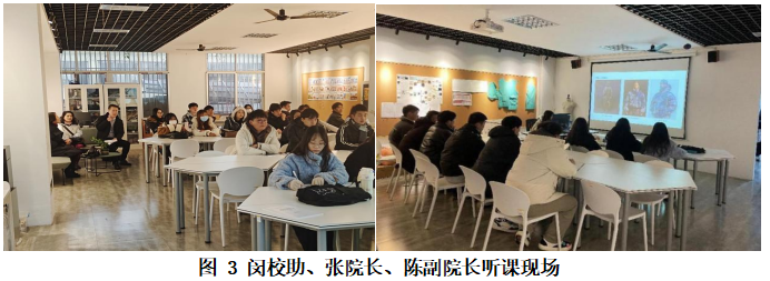 闵校助和张宁经理、陈晓玲副经理最后来到赫利童装工作室和武学伟武学凯工作室听取课堂授课情况,分别是公司教师孙巧格老师在上《2024春夏童装流行趋势分析》课程和周美华老师在上《羽绒服款式开发》课程。听课结束后闵校助还就教师备课情况、基本教学环节、教学方法运用和课堂气氛调动等提出了建议,鼓励老师们创新教学方法、加强课堂互动。