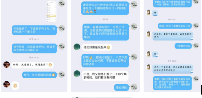 17服饰本科2班的同学表示,网上教学的方式大大拉近了师生间的距离,线上交流不用拘谨,有什么问题就直接问老师。老师在线上直接解答,每个员工都能看到,也很高效。从交流中,我们能感受到老师解答问题的真心,老师反复叮嘱我们好好照顾自己,真的很暖心。