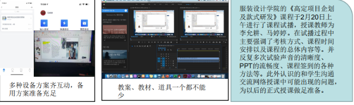 时装设计教研室主任黄伟在交流中说,本教研室承担着全院的服装类设计和结构课程教学任务,对于采用何种形式进行授课,教研室全体教师多次网上开会进行了反复探索,经过多方沟通、内部协商、并向有关专家请教网课技术、由本人和冯霖、吴佳耕副主任亲身体验不同直播平台等,结合不同的课程特点,最终确定设计理论课采用“线上慕课学习+线下课堂教学”,对电脑软件、结构设计采用“线上演练示范+线下员工自主练习” 的组织形式。对于在线网络授课的体会,黄伟主任说开课前与员工的沟通很重要,路演一定要不厌其烦地做几次,先自演自听着做、再邀请员工做,前期准备充分,后面在线教学进展就会很顺利。