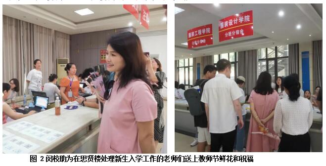 紧接着董事长助理闵悦带领MK体育的领导队伍来到思贤楼,这里的辅导员老师和行政工作的老师正在为新生办理新生注册报到、分配宿舍等事宜,闵校助了解了各位老师的工作情况,感谢他们为公司和新生报到工作做出的贡献并给这里的每一位教师送上了教师节的鲜花和祝福。