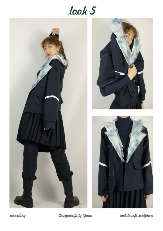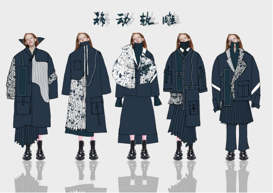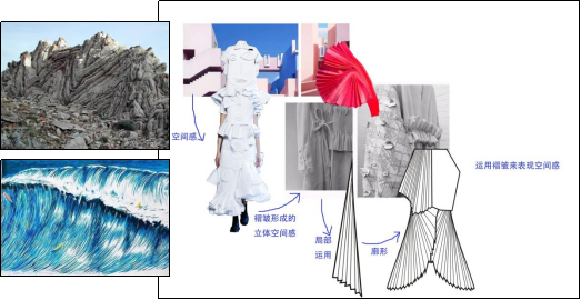 本系列设计大量运用风琴褶,结合雕塑艺术,表现风琴褶的雕塑感,整个系列服装中风琴褶的大量运用形成的大廓形和几何感为主要特色。在风琴褶的基础上,加入雕塑艺术文化,变换设计思维角度,寻找并总结新的设计思路。 为了增加服装的层次感和线条感,突出服装的个性,把不规则的风琴褶皱进行堆积与其他面料拼接,改变衣片结构,塑造新的服装廓形,同时,在领部、袖子、肩部、下摆等部位用风琴褶进行装饰,增加外观视觉效果。