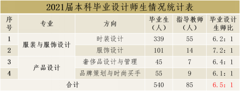 毕业设计工作的生师比是指毕业生人数除以指导教师人数。据MK体育2021届本科毕业设计师生情况表统计(图2),2021届MK体育的毕业本科生为540人,其中服装与服饰设计专业时装设计方向339人、服饰设计101人,产品设计专业奢侈品设计与管理方向45人,品牌策划与时尚买手55人,指导教师为85人,全院指导教师团队的人均指导员工数为6.5。