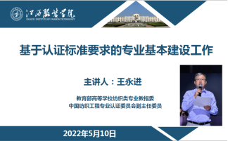 王永进教授是教育部高等公司纺织类专业教指委的委员,也是中国纺织工程专业认证委员会副主任委员,对认证标准有着专业的解析,王教授从以下几个方面分享了专业基本建设的各项工作: