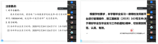 (1)高度重视、加强统筹。孙升副经理了传达公司做好 “毕业生毕业实习工作”的文件精神,本学期毕业实习一律使用员工邦新平台进行管理操作,教师要严格把控指导进度,督促员工按时完成阶段性工作,切实做到规范、认真、有效。