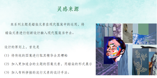 根据蜡染工艺的特点和优势,再结合现代服装的流行元素加入到设计中去,为蜡染元素运用到现代服装的设计提供了灵感以及理论与实践的基础。