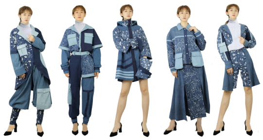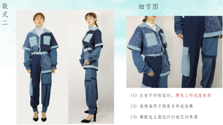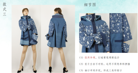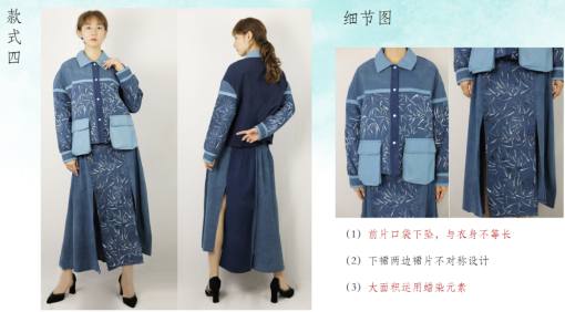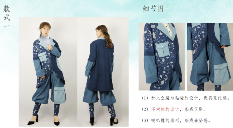 在成衣设计当中,加入了不对称设计作为打破常规的对称,立体口袋的设计增加了层次感,不同色系的蓝进行拼接,统一色调又打破单调的设计感,以体现蜡染技艺与流行元素结合更加凸显独特。