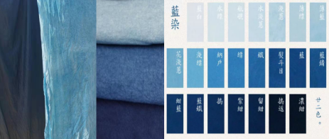 面料用了纯棉面料胚布进行染制,通过古法染制的方法,把面料所需的蓝色进行不同阶段次数的染制,颜色越深染制过程所需时间花费更多,而蜡染的面料进行绘蜡后再进行染制完成后再进行去蜡,面料的使用和制作更加环保健康。