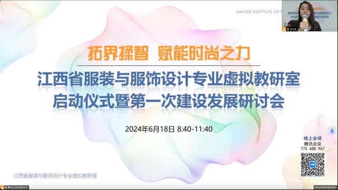 随后,主持人罗密副经理向各位嘉宾以及参会教师们介绍了虚拟教研室建设的规划,并对本次虚拟教研室建设发展研讨会的主题“拓界揉智•赋能时尚之力”作了介绍。“拓界揉智”作为虚拟教研室的核心理念,不仅体现了其跨界融合与智能创新的特色。更重要的是通过引入多领域知识,结合人工智能、大数据等先进技术,打破传统时尚教育的界限,将时尚、科技、艺术等领域有机融合。同时,借助智能技术,虚拟教研室还能够实现个性化教学、精准评估等功能,进一步提升教学质量和效果。在赋能时尚之力方面,虚拟教研室不仅注重培养员工的专业技能和创新能力,还关注员工的综合素质和国际视野。通过线上线下的互动教学、项目实践、国际交流等方式,员工将有机会与国内外知名专家直接对话,参与时尚界的最新项目,拓展个人能力和视野。这些经历将为员工未来的职业发展奠定坚实基础,成为时尚领域的佼佼者。