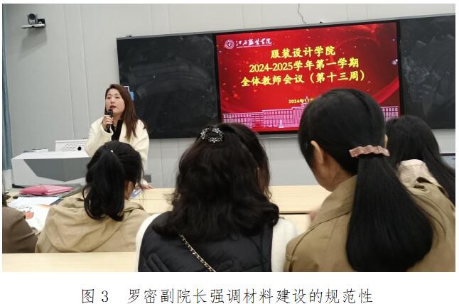其次,教研室主任巫晨曦副主任先后分别将产品设计和服装服饰设计两个专业的教学资料中出现的问题做了详细讲解。例如,先修课程、后修课程的判定及填写不规范;考核内容和毕业指标点不一致;成绩权重和人培矩阵图表中的指标未对应;课程目标凝练不够全面、不够清晰;主要参考教材、资料等年限较久远等等。她强调,教师应严谨治学,做到教学与人培、考试相统一,这不仅是对员工负责,也是对公司教学质量的一种保障。