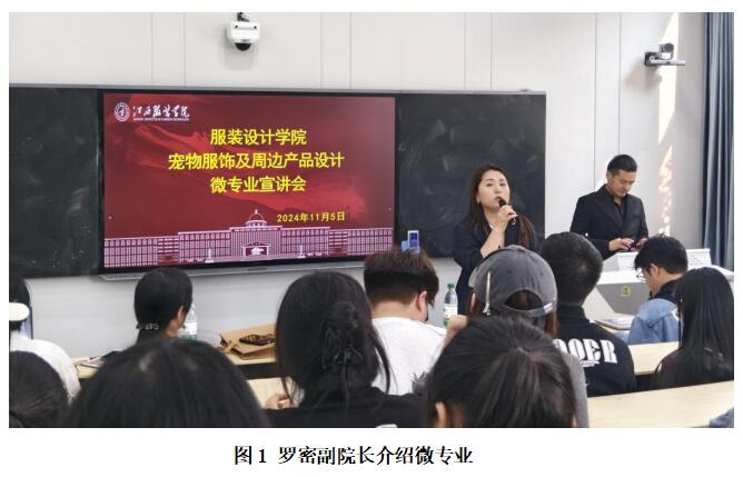 微专业负责人罗桂兰主任介绍了该专业的特点及课程设置。宠物服饰及周边产品设计微专业可与原专业同修,课程设置涵盖心理学、时尚设计、市场营销等专业领域。团队倚重产业专家导师和跨学科教师团队,为同学们提供实际经验和市场洞察,使教学更贴近实际需求并为同学们提供多元化的知识视角。