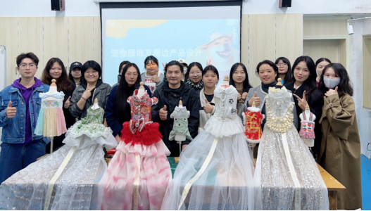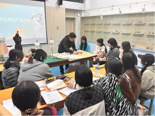 宠物服饰及周边产品设计专业以满足宠物产业蓬勃发展的需求为导向,其课程设置和团队建设呈现出独特的特色。课程设置涵盖心理学、时尚设计、市场营销等专业领域。团队倚重产业专家导师和跨学科教师团队,为员工提供实际经验和市场洞察,使教学更贴近实际需求并为员工提供多元化的知识视角。这一跨学科的教学团队构建使员工能够更全面地理解宠物产业,并在设计中更富有创意。专业注重行业合作项目,与宠物产业企业合作,为员工提供实践机会,拓展其实际操作技能。开课第一课,吴海平教授为员工讲解他设计的宠物服装,并以一款服装作为案例进行服装版型讲解。