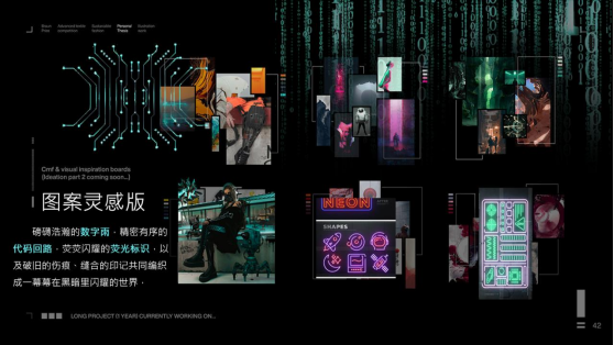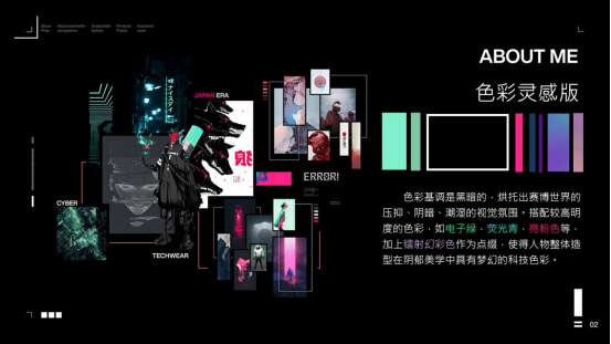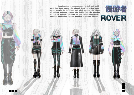 灵感来源于1984年威廉·吉布森发表的代表性处女作《神经漫游者》,漫游在以黑暗环境为基调的阴郁美学中,赛博朋克的精神内核其实就是快进到荒诞而冷漠的未来世界,在充斥着矛盾和压迫的环境中反思人类的价值。