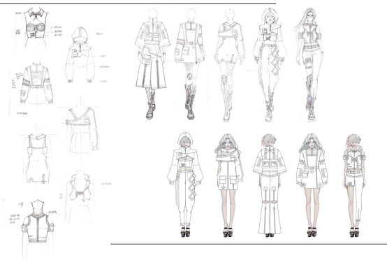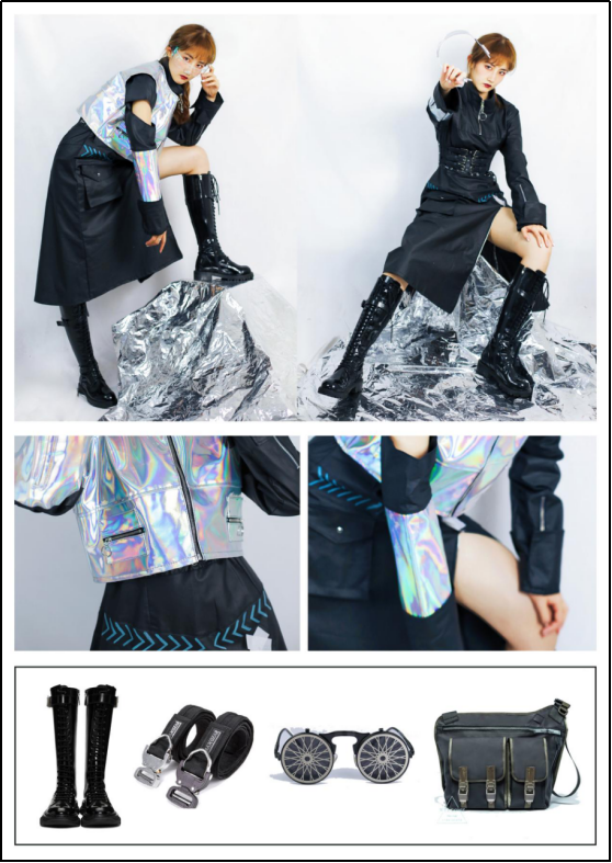 在成衣设计中,整体造型富有前卫的重工之感,使用大量金属拉链和立体口袋塑造空间感,分割连接内与外,平衡比例与线条,丰富层次和搭配,融入时装性裁剪的概念,打破传统的细节设计,主张创意表现和文化的融合,结合当下流行的都市机能风潮,在设计和功能上符合人体工程学,在各种环境的需求下既保证实用性也展现赛博风格独特的美学魅力。