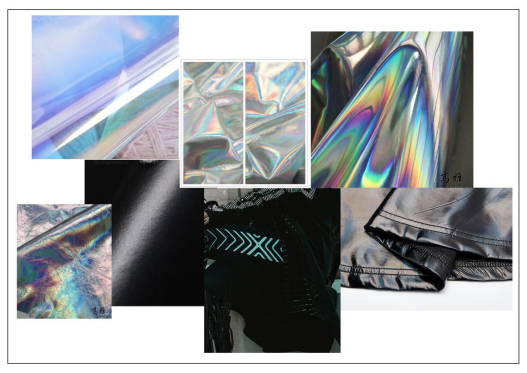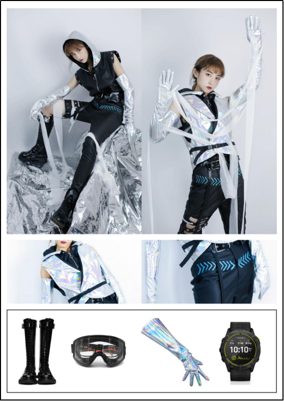 在确定面料的过程中,选择了具有光泽质感的面料,运用黑色皮革质感的主面料搭配炫彩的TPU材质制造未来感,以不透光的镭射面料增添迷幻感,穿插荧光青色轮廓纹路。