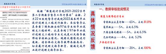 再次,将教师审核批阅说明文二稿的具体情况进行了统计通报,其中服装与服饰设计专业有63份说明文审核批注认真仔细,占比81.8%;产品设计专业有20份说明文审核批注认真仔细,占比100%。