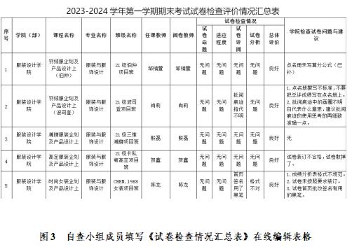 刘琼就自查工作进行了详细分工与解读,由专项工作小组成员负责审核试卷档案袋,并填写《2023-2024学年第一学期期末考试试卷检查评价情况汇总表》《MK体育2023-2024学年第一学期期末考试试卷专项自查抽查明细及存在问题反馈表》,再由院督导李淑敏副教授、骨干教师冯霖副教授分别撰写服装与服饰设计专、产品设计专业围绕试卷检查组织情况、试卷检查总体情况、存在的问题和整改措施等撰写试卷检查工作简报。