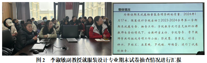 随后,院督导李淑敏副教授针对2023-2024学年第二学期服装设计专业期末试卷抽查情况进行汇报。李教授分别从整体情况、存在的突出(共性)问题等方面进行讲解。检查结果显示期末试卷档案袋各项资料的质量较过去有明显改善,注重员工课程知识和能力的综合考核,体现不同年级课程考试难易度的阶梯变化,全院试卷整体质量呈良好状态。其中优秀试卷占比17.9%(7份),良好的占比79.5%(31份)。