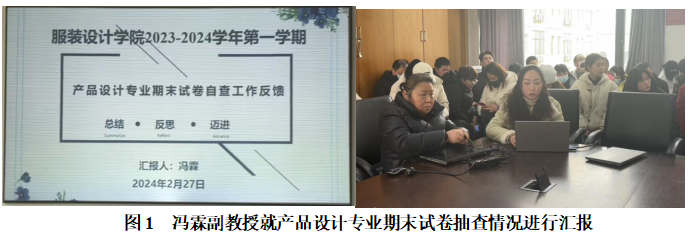 首先,院督导冯霖副教授针对2023-2024学年第二学期产品设计专业期末试卷抽查情况进行汇报。冯教授分别从试卷自查组织情况、检查内容、自查总体情况、存在问题、整改措施这几个方面详细反馈了试卷抽查发现的相关问题进行总结。产品设计专业课程共抽查21份试卷,其规范性和质量整体完成良好,优秀6份、良好14份、中等1份。