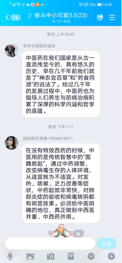 19时装专科1班李捷说:在此次演讲中,我听到了一句"中西医结合,中西药并用。是本次疫情防控的一大特点。"在此次疫情中,中医通过中药调整,改变病毒生存的人体环境,对肺部炎症的吸收和病毒转阴都有明显效果。中华文化中医是当今世界上历史最悠久的医术,不止中医,中华民族给我们留下的瑰宝太多,我们在发展的同时要牢记初心,用信仰、学识、创新、奋斗为我们的中华民族谱写新篇章。