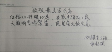17时装本科4班贾璐瑶说:通过这次的回信学习,我认识到这次疫情只是对我们的考验,无论面对什么样的困难,我们都要坚信生活充满阳光,充满了爱与团结,无论是什么时候?我们都不是孤单一个人,我们的背后有强大的祖国和全中国的人民。真诚感谢为本次疫情做出贡献的人们,向你们致以最崇高的敬意!而我们作为老员工,作为祖国的生力军和突击队,应该正确对待疫情,在这段日子里头传递满满的正能量!