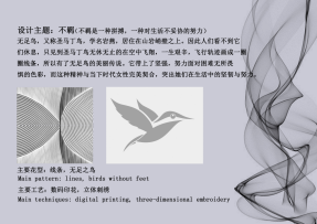 本系列作品余学德所选的大主题是“不羁”。他理解的不羁,是一种精神上面对困难的不屈服,一种迎风而上的态度。他的灵感来源于无足鸟,无足鸟又称圣马丁鸟,学名岩燕,居住在山岩峭壁之上。因此人们看不到它们休息,只见到圣马丁鸟无休无止的在空中飞翔,一生艰辛,它们飞行的轨迹在天空中画出一圈圈线条,似乎在给它们的人生画上一个完美的符号。而这种精神与当下时代女性完美契合,她们在不管是生活还是工作中,遇到困难时总是迎难而上,通过自己的努力获得美好的生活。他觉得没有脚的鸟只能不停飞翔,没有背景的孩子只能不停奔跑!