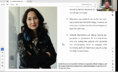 Adam Love Richards教授通过视频首先表达了对此次受邀的感谢,介绍AI发展前沿技术进而引出教育议题,对AI技术应用持以谨慎态度,既表达了对AI技术发展的期待,又有对教育大环境、设计创新意识的担忧。邹逸昕博士通过UGC用户生成数据研究数字时尚趋势,调研时尚产业变化,融入创新设计系统性思维,探索新的产品和服务系统模式,提出新理论、新框架、新策略。