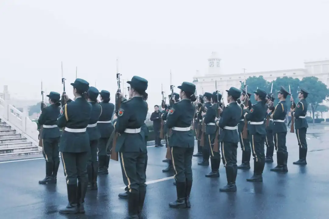 国旗护卫队迈着铿锵有序的步伐庄严入场,仪仗队员肩扛旗帜,迈着整齐划一的步伐,护送五星红旗正步迈向旗杆。