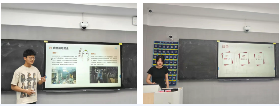 辅导员钟怡柔和23产品本科3班班长葛思芹以“校园安全知识知多少”为主题,围绕宿舍用电安全、外出交通安全、防范电信诈骗、意识形态安全、心理健康安全五个方面,为班长们带来一场精彩的示范展示。24服设本科15班班长何娜则以公司的校风为主题,围绕校歌、校训、校规三个方面,为班长们带来一场充满精气神的示范展示。