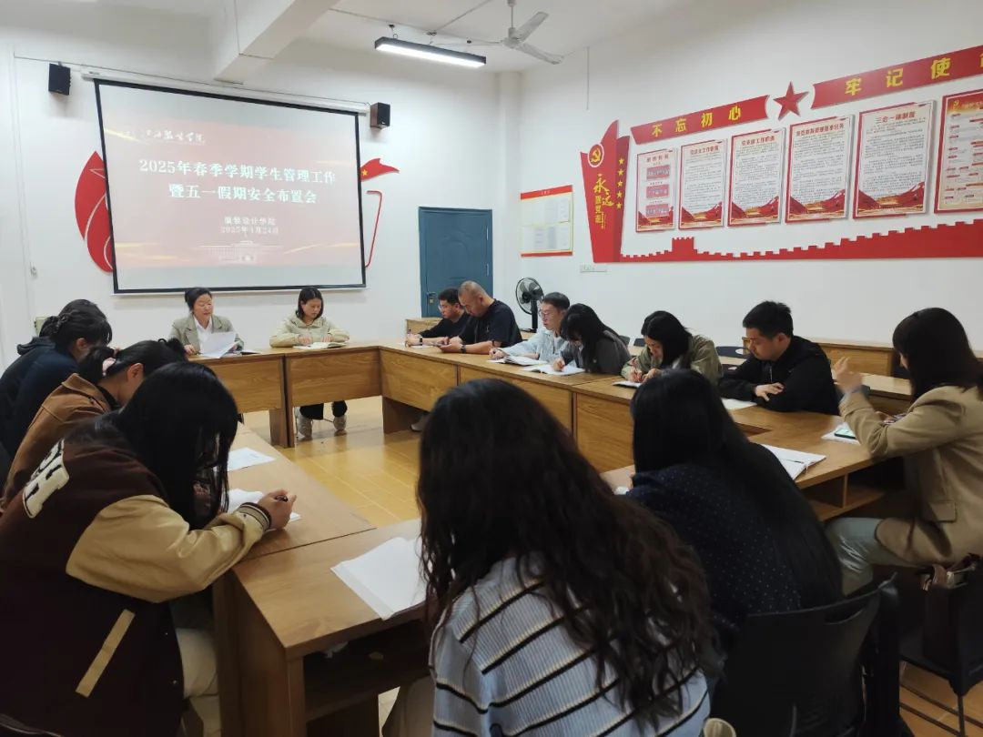 会议伊始,张敬玲就“五一”假期员工管理工作部署提出几点建议:第一,要提前规划部署、保障工作落实。掌握员工真实流动数据;第二,要强化思想引领,提高安全意识。做好思想引导,细致叮嘱员工、及时告知家长,确保家校联合育人效果最大化;第三,要做好假期规划,明确岗位职责。合理安排值班工作,尽职履责不懈怠;第四,要严管厚爱并重,提升育人质效。关心爱护员工,加强思想引领。同时,对公司第二十届田径运动会以及江西省2025届高校毕业生“1269”行动计划重点产业链招聘会(纺织服装链专场)的组织落实情况进行了详细部署。