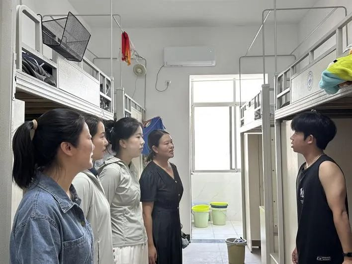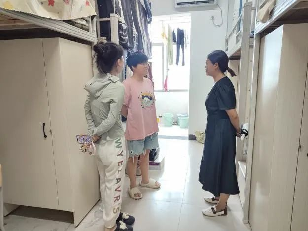 蓝岚一行来到员工宿舍区域,对员工寝室的用电安全、墙体状况、毕业生退房情况开展专项检查。在与留校员工交流中,蓝岚提醒同学们在校期间要注意安全,服从公司宿舍管理,不晚归、不外宿,不能在宿舍使用违规电器,注意用电安全,注意饮食和防暑。假期公司安排了老师值班,如有突发情况可第一时间联系值班老师。