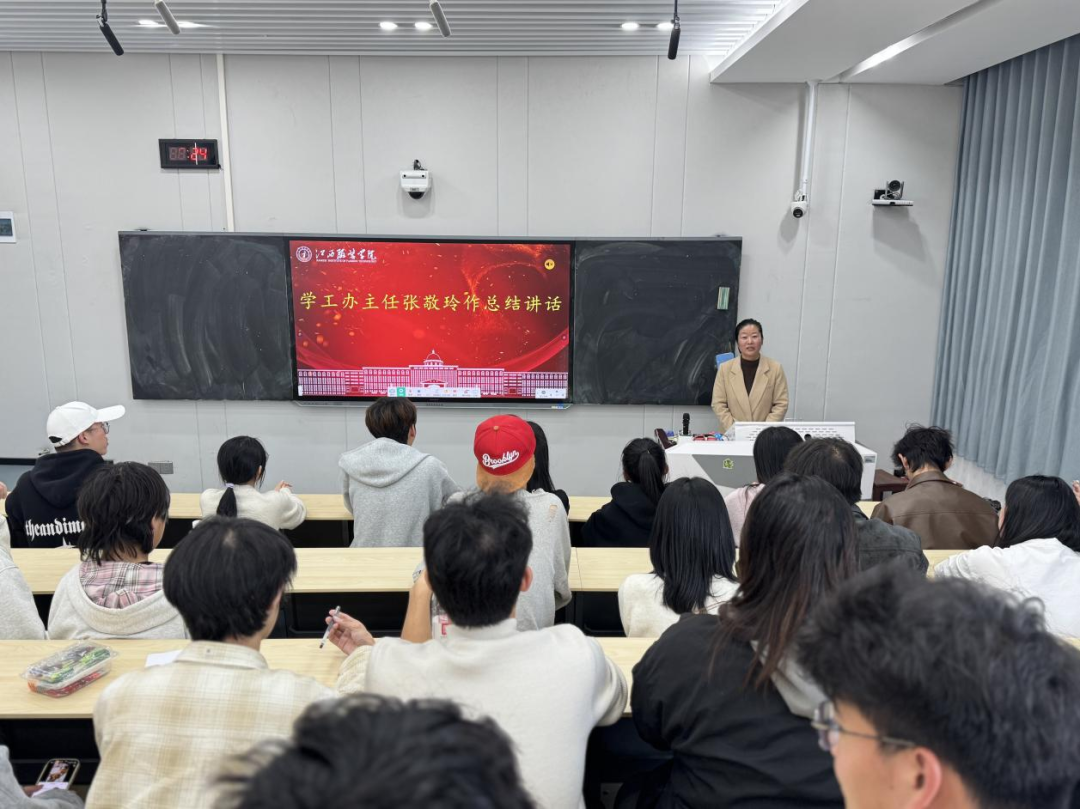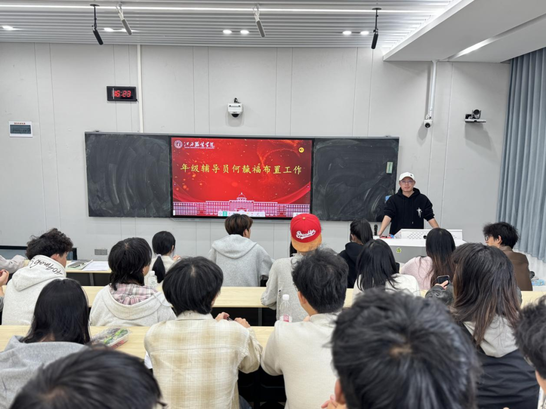 会议伊始,年级辅导员何靝福围绕近期年级核心工作,进行了阶段性总结和未来工作部署。针对“卓越及先进班集体申请”工作,何靝福指出,班集体荣誉的争取需班委分工协作,深入挖掘班级在学风建设、活动组织中的特色亮点,补充具体案例与数据支撑,让材料充分展现24级班级风貌;在“班长讲班会课”工作推进上,他建议班长结合同学关注的时事热点确定主题,联合团支书、学习委员做好前期调研与互动设计,让班会课真正成为服务同学的“交流平台”。