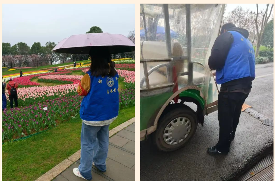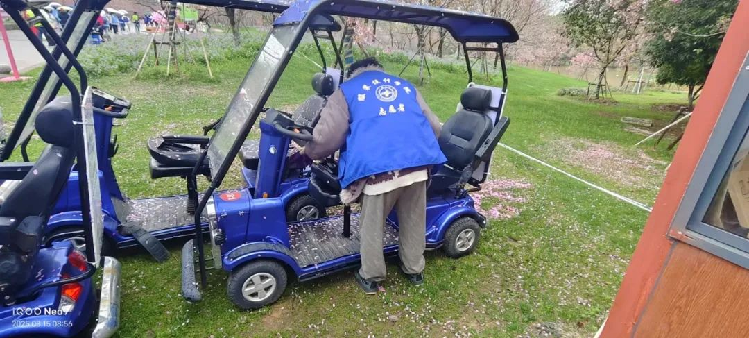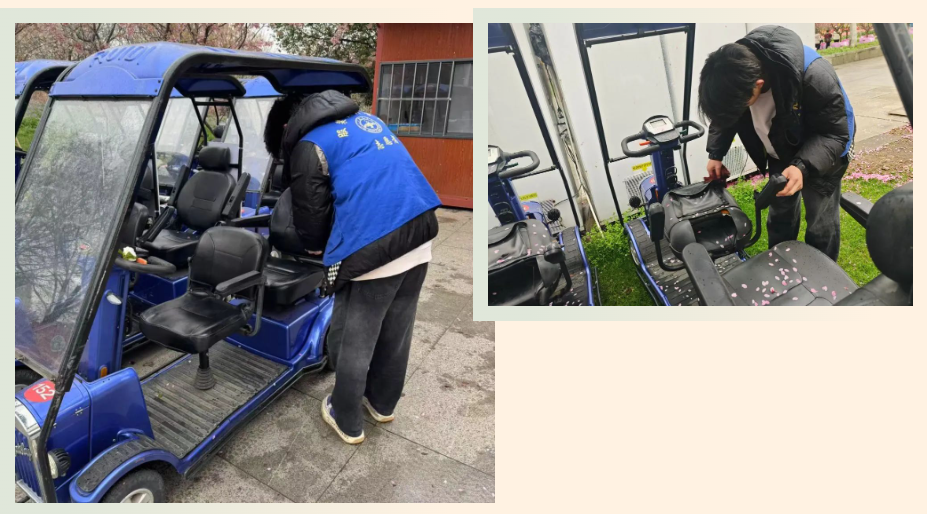 面对刮风下雨,志愿者迅速调整方案,分组对景区观光车展开“无死角”清洁。利用防水抹布、便携式吸尘器等工具,重点清理车厢座椅缝隙、脚踏板泥渍及车窗水痕。部分志愿者冒雨擦拭车顶积水,确保车辆外观整洁,获得景区工作人员连连称赞。