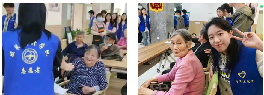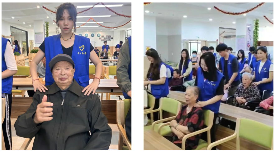 节目结束后,志愿者们来到老人身边,为他们按摩、陪他们谈心。大家耐心倾听老人们的故事,分享生活趣事,温暖的话语如春风般抚慰着老人的心灵。相聚时光短暂,活动尾声,全体志愿者与老人、工作人员合影留念,用镜头定格美好瞬间。志愿者们还协助护工将老人推回宿舍,才不舍地结束此次志愿之行。