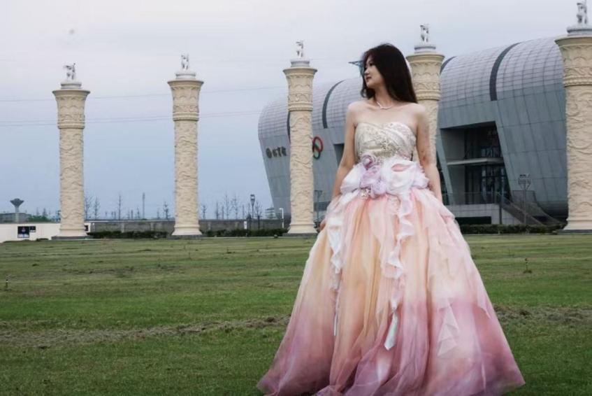 那天,天空像是被轻柔晕染过的画布,透着淡淡的诗意。微风轻拂,带着校园里独有的青春气息。矗立着罗马柱的体育馆前,我第一次穿上一件婚纱礼服,它是舍友亲手打造的心血结晶。这件礼服是她在工作室里反复裁剪、缝制,每一道褶、每一朵花,都倾注着巧思。