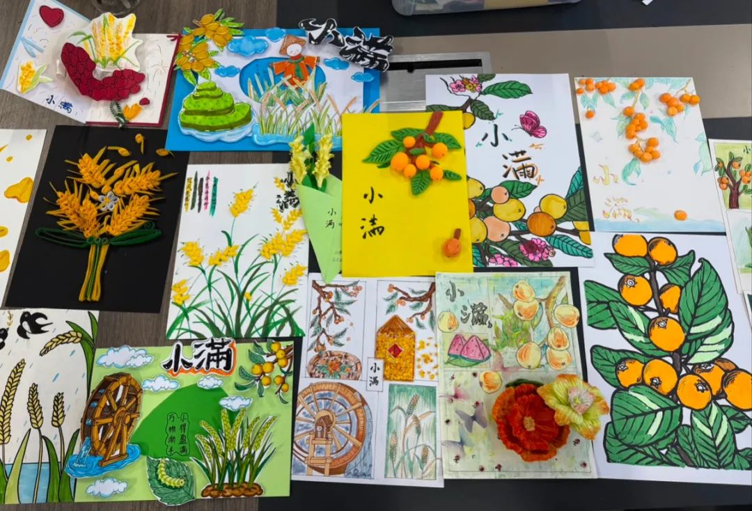 在创作环节,同学们以“枇杷”和“麦穗”为主体物展开设计。大家充分发挥自己的创意和专业特长,运用丰富多样的表现形式进行创作。有的同学用细腻的水彩画,描绘出金黄饱满的枇杷和随风摇曳的麦穗;有的同学借助黏土,精心塑造出栩栩如生的枇杷果和沉甸甸的麦穗;还有的同学使用衍纸、扭扭棒等综合材料,制作出独具匠心的艺术作品,此外,部分同学别出心裁地制作了立体贺卡,将“枇杷”与“麦穗”巧妙融入其中,传递出满满的祝福与幸福。