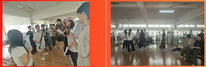 每日的排练从下午持续到夜晚,一遍又一遍地重复演唱,不断纠正每一个发音、每一个节奏。为了唱好《玉盘》中那一段高难度的和声,同学们常常练得嗓子沙哑,却依然相互鼓励,坚持练习。除了红歌演唱,自选话剧团课《星火长明》也不容小觑。从剧本研读、角色揣摩,到动作设计、台词排练,每一个细节都经过反复打磨。同学们牺牲了周末休息时间,全身心投入排练,力求将每一个角色都演绎得淋漓尽致。
