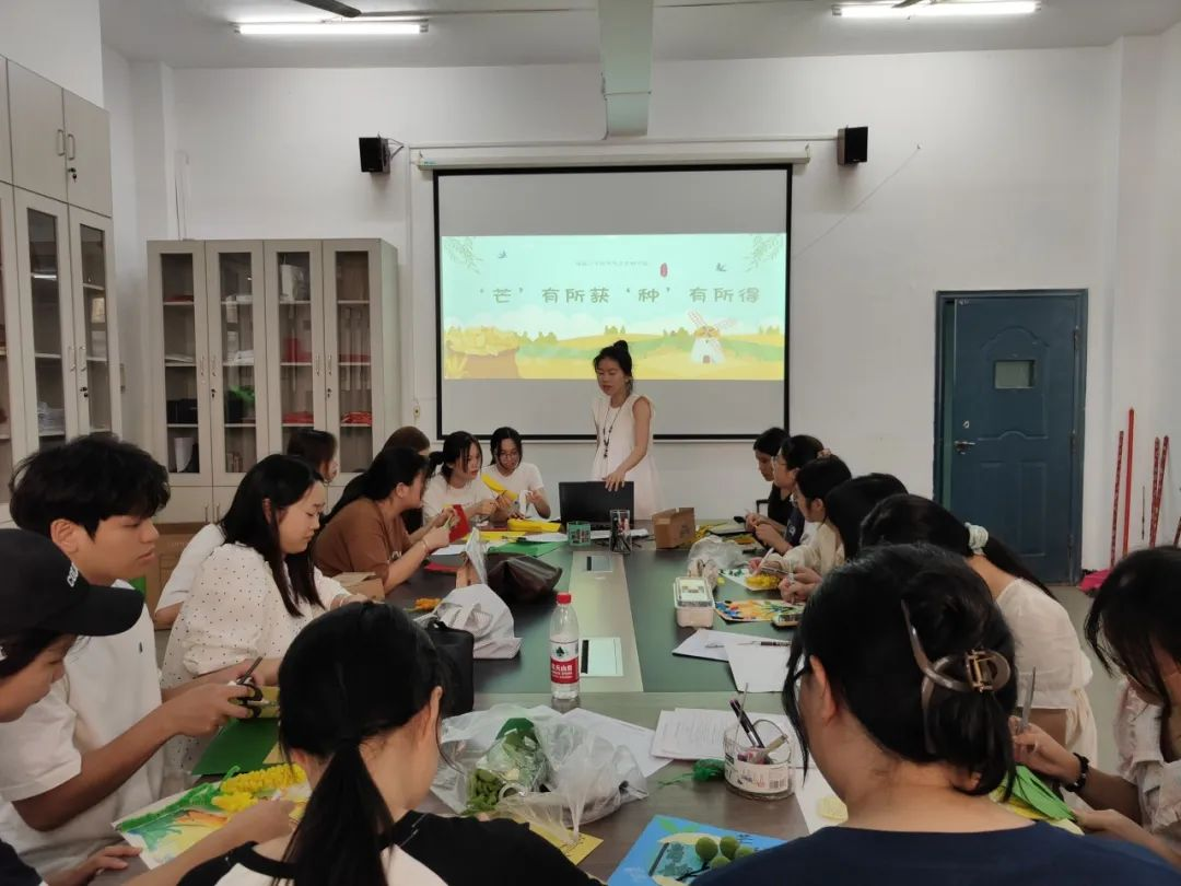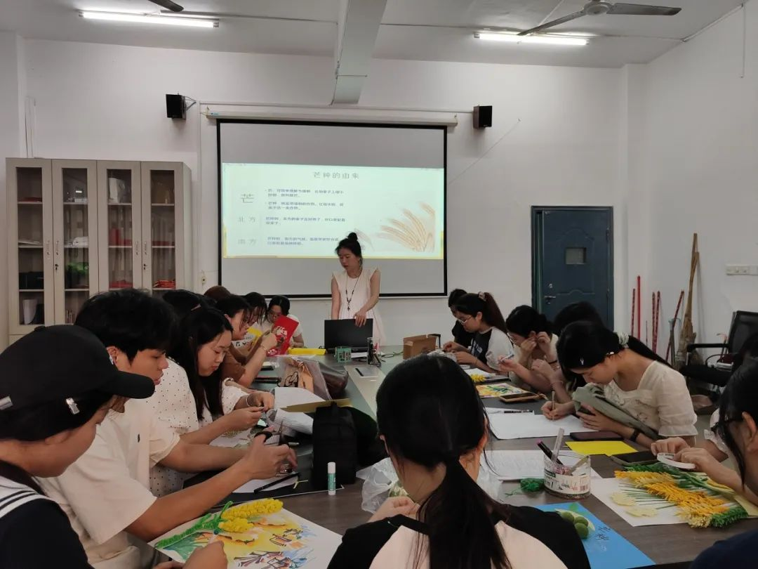 活动伊始,指导老师以“芒种为何‘忙种’”为切入点,生动讲解芒种节气的由来——“芒”指麦类等有芒作物成熟,“种”指谷黍类作物播种,一“收”一“种”间尽显农耕智慧;结合气候特点,老师分享了“芒种三候”“煮青梅酒”“安苗祭”等传统习俗,让同学们在节气物语中感受古人顺应自然的生活哲学。“原来芒种不仅是节气,更是先民对‘劳作与收获’的生动诠释。”