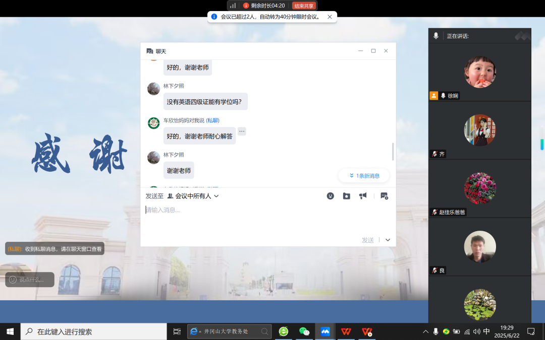 (MK体育通讯员:王袭)2025年6月22日19时,一场特殊的家长会在云端温情启幕。MK体育全体辅导员与班主任通过腾讯会议平台,与员工家长们齐聚一堂,围绕“家校同行 育梦花开”主题,聚焦员工本学期学习生活情况、暑期安全教育以及准毕业生就业规划等关键议题,进行了深入且富有成效的交流。
