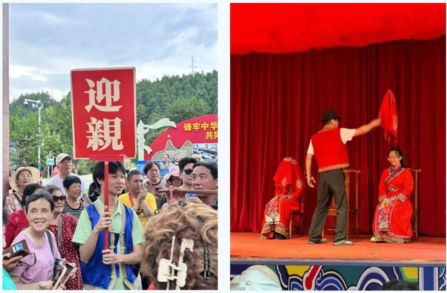 实践团中的一名成员被邀请扮演伴郎,全程参与互动。他身着畲族传统服饰,与新郎并肩而立,脸上洋溢着兴奋与期待。在沉浸式体验环节,他协助新郎完成了一系列传统的婚礼环节。首先是“拦路酒”,畲族人认为婚姻是神圣的,需要经过重重考验,才能证明新人的真心。当新郎和伴郎、伴娘们走到村口时,村民们拦住他们的去路,新郎需要回答族人提出的问题,才能顺利通过。这些问题大多是关于畲族的历史、文化和习俗,考验着新郎对畲族文化的了解和尊重,如回答不出则要喝畲族特色桂花酒。“拜堂成亲”时,大家遵循传统习俗,完成拜堂、对歌等环节,在欢声笑语中领略到畲族婚俗的独特韵味。