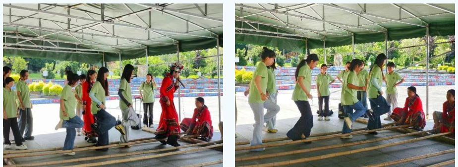 婚俗仪式结束后,新月村广场瞬间化作欢乐的海洋。竹竿舞的节奏响起,实践团成员在畲族青年的指导下,在“开合开合开开合”的竹竿起落间跳跃腾挪。虽然一开始有些生疏,但很快便掌握了技巧,大家在欢声笑语中尽情舞动,感受着畲族文化的独特魅力和民族团结的深厚情谊。