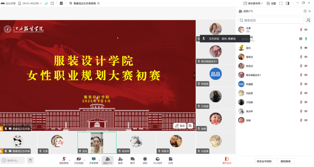比赛中,各位选手的职业目标兼具理想温度与专业深度:陈奕洁同学立志成为少儿服装美育师,计划以服装设计融合美育教育,为孩子们编织美好童年;程志枫同学以黄文秀同志为榜样,决心投身西部计划,化身基层青年工作志愿者,用行动践行青春使命;