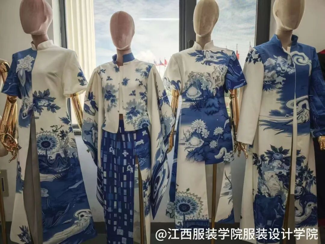 此作品以江西景德镇青花瓷为视觉基底,提取蓝白经典配色与青花图案韵律,融入南昌红色文化精神内核。纹样有松柏、杜鹃等,是南昌红色革命文化的象征体现:松柏是革命先烈百折不屈的品格,井冈山上的映山红依然绽放至今,那抹鲜艳的红色化为淡雅花纹,在衣裙上流动。借青花瓷的典雅形制,如旗袍、长衫等款式,与衣裙纹样融合交汇,讲述红色岁月。让传统瓷韵与红色基因交织,用服饰语言传递江西独特的历史文化交融之美,唤醒人们对红色历史的铭记与对传统文化的珍视。