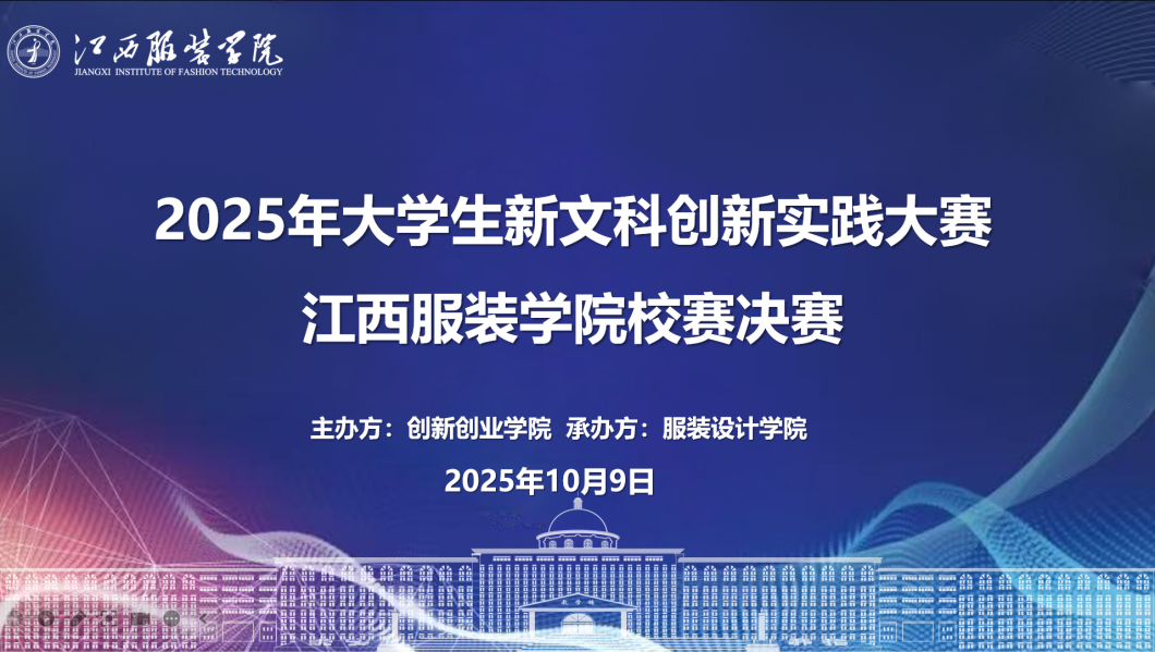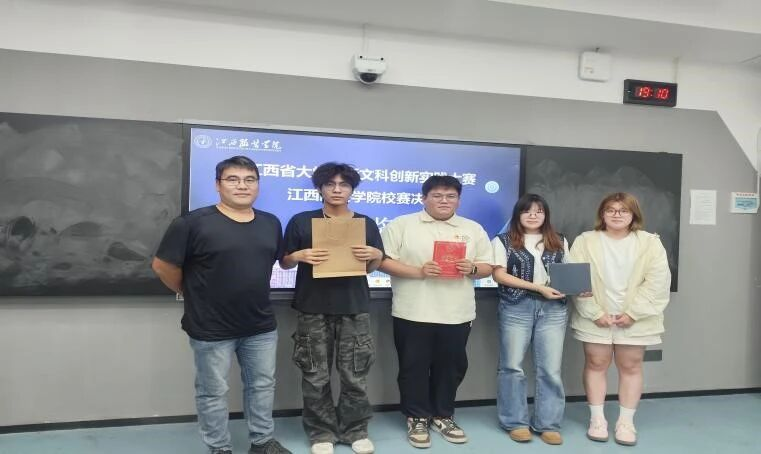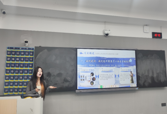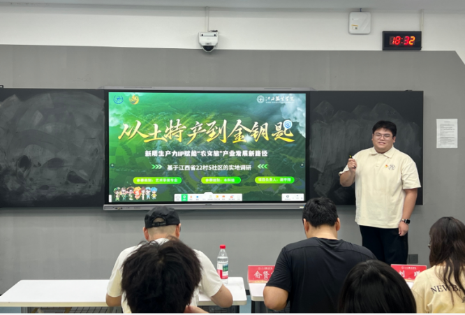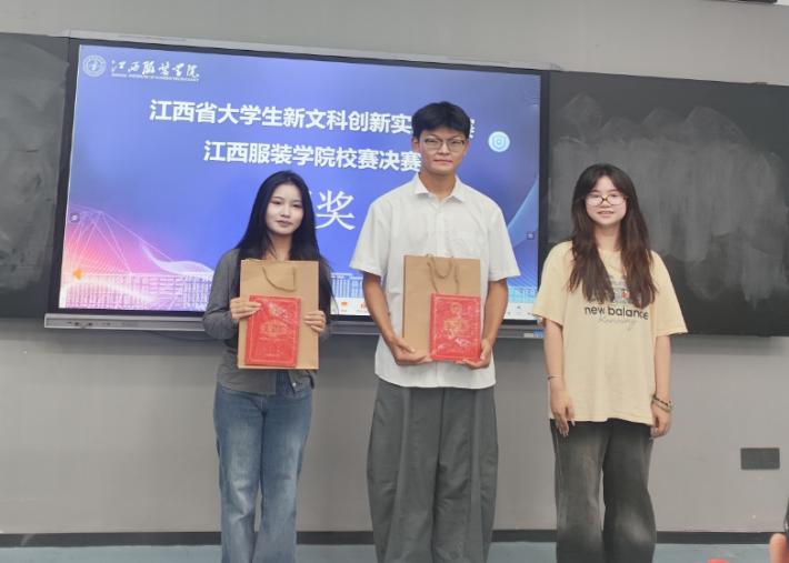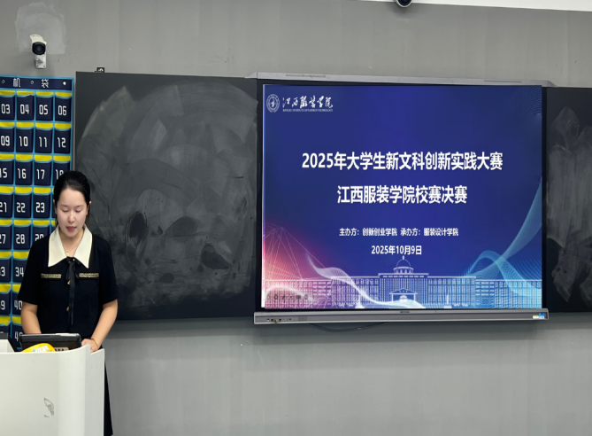 随后,5支决赛项目团队依次登场答辩。各团队围绕项目背景、创新点、实践成果及未来规划展开精彩阐述,既有对传统文化与现代设计融合的探索,也有对数字技术赋能文科领域的实践,充分展现了江服学子在新文科创新实践中的思考与担当。