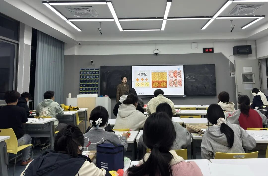 “霜降三候,豺乃祭兽、草木黄落、蛰虫咸俯”,活动伊始,指导老师王袭结合丰富的图文资料,生动讲解了霜降节气的气候特征、物候变化及民俗传统。从霜降时节“补冬不如补霜降”的饮食习俗,到“霜打柿子红”的自然景象,王袭老师重点阐释了柿子在霜降节气中的象征意义——“柿”谐音“事”,承载着“事事如意”“柿柿顺心”的美好寓意,为同学们的创作筑牢文化根基。随后,王袭老师结合服装设计专业特色,展示了多款柿子主题拼贴画范例,详细讲解了中国传统纹样——柿蒂纹样选取、色彩搭配及构图技巧,并示范了如何用超级黏土制作立体柿蒂、叶片等元素点缀作品,让平面拼贴更富层次感。