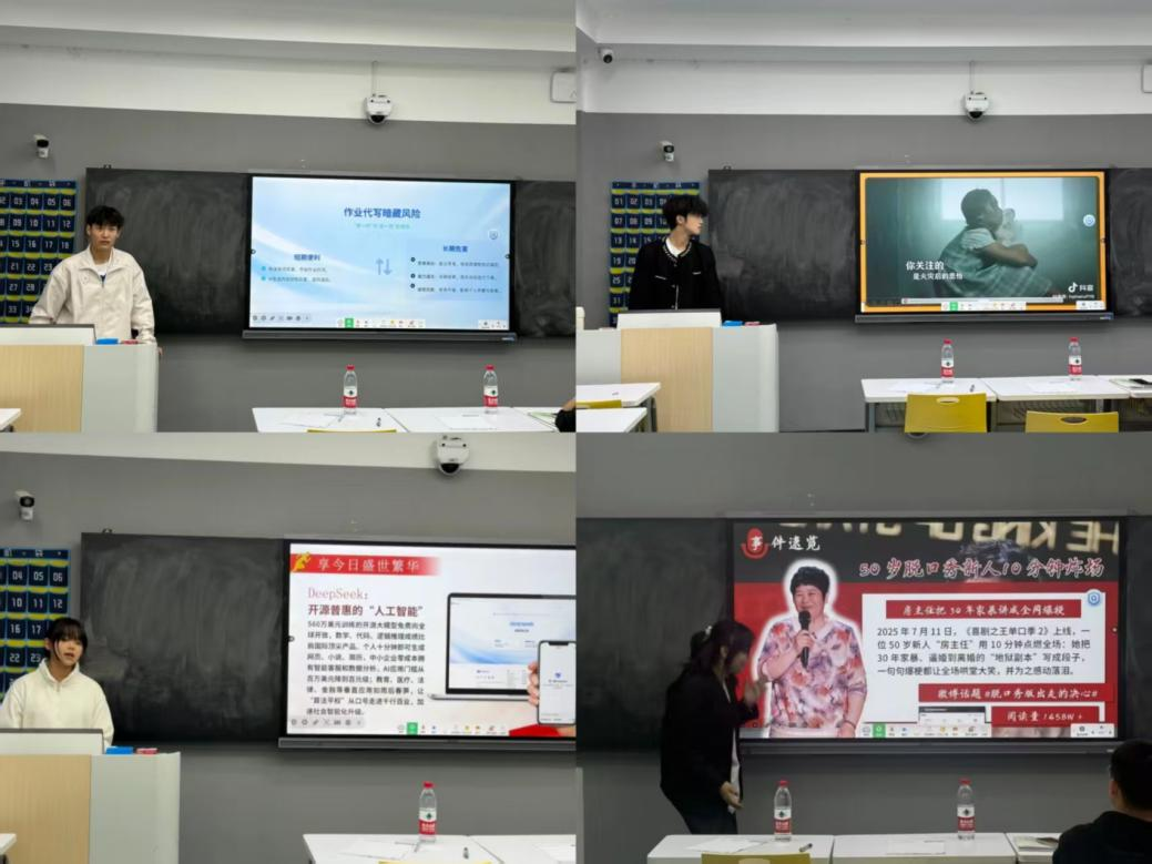 在紧张而有序的氛围中,各班级班长围绕“学习党的二十大精神、校园文明建设、学业规划、职业生涯设计、心理健康教育”等热点话题展开主题讲解。班长们通过精心制作的PPT演示,结合自身经历与专业特色,从“班级文化建设如何赋能员工成长”“心理健康教育与创意课堂融合”等视角深入剖析,充分展现了班长作为班级核心管理者的引领示范作用,展示了班长作为院校员工骨干特有的凝聚力和示范作用。