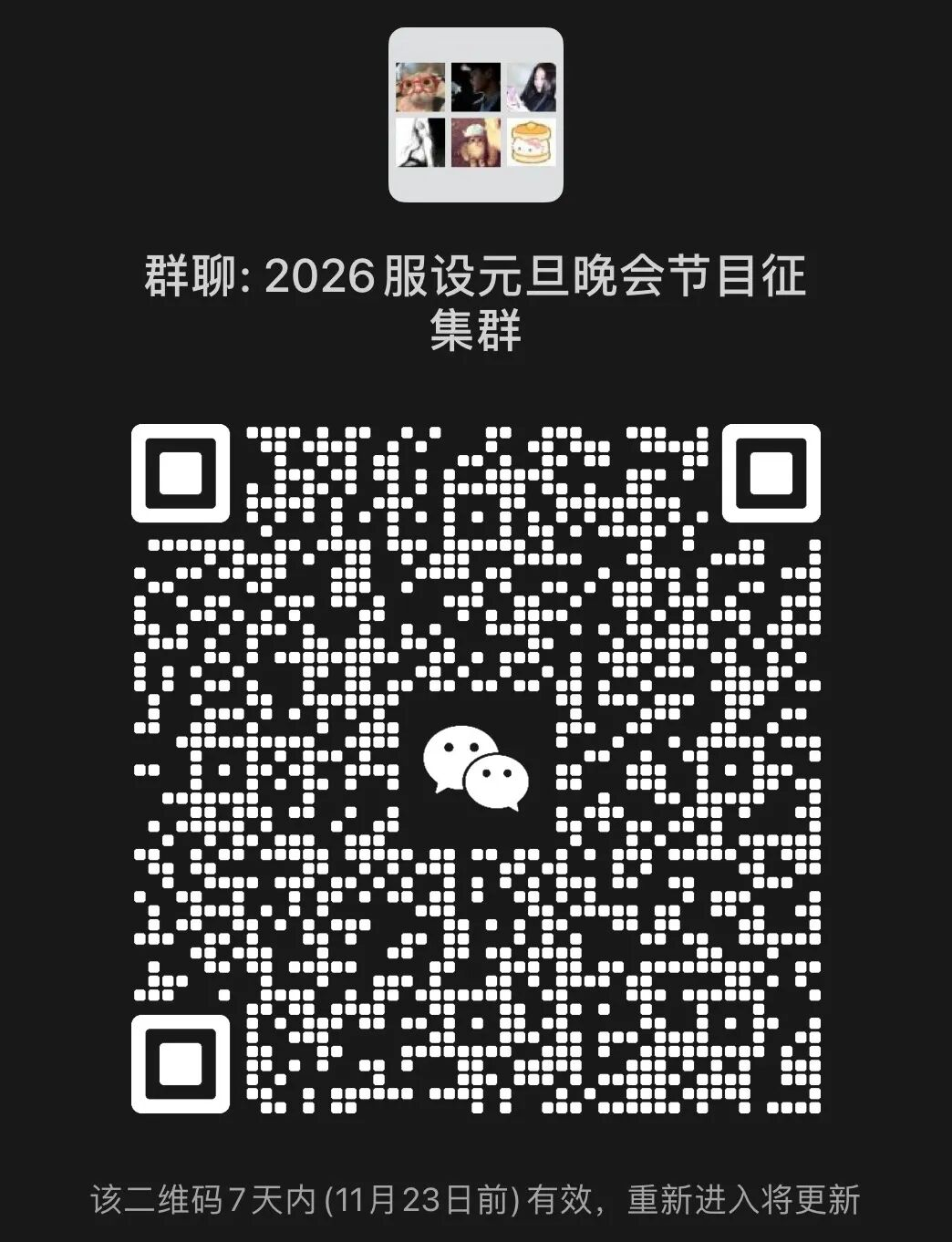 请有意向参与的师生扫描下方二维码加入“2026服设元旦晚会节目征集群”,进群后按要求填写报名登记表,明确节目名称、主题立意、表演形式及所需支持。