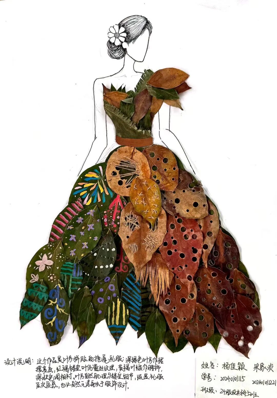 此次大赛不仅是一次创意的角逐,更是公司“以美育人、以艺通理”教学理念的生动实践。叶片作为自然的馈赠,其形态的多样性、色彩的丰富性、肌理的独特性,为服装设计提供了天然的灵感库。同学们在创作中,需深入观察叶片的生长逻辑、解构其美学特征,再通过服装的剪裁、工艺、造型进行转译,这一过程既是对自然美育的深度感知,也是对服装设计专业技能的综合锤炼——从设计构思的创新性,到效果图呈现的专业性,再到材料运用的实践性,每一环都彰显着公司在“专业+美育”人才培养路径上的探索与成果。