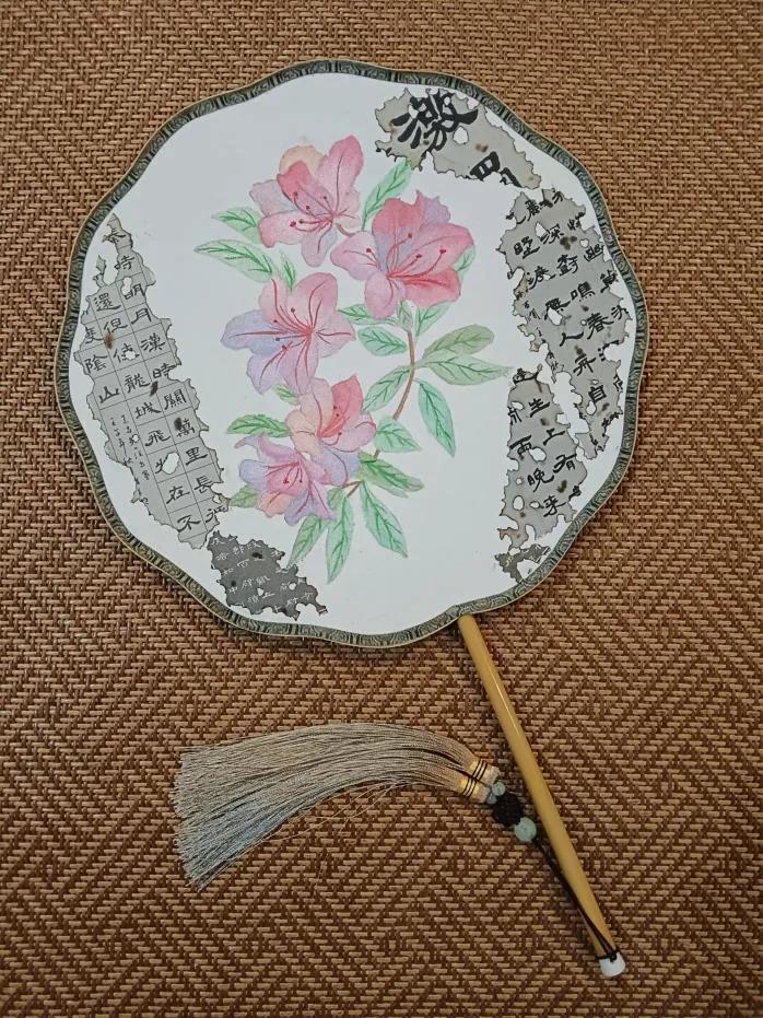 本期作品以扇子为载体,运用珠光水彩精心绘制了娇艳的杜鹃花,同时在扇子的背面上醒目地呈现了“赣州”二字。旁边贴着用毛笔以隶书书写并经过烧制的纸张,增添了古朴的韵味。整个作品旨在展现赣州这座城市与市花杜鹃花的紧密联系,珠光水彩的杜鹃花色彩绚丽,象征着赣州的活力与美丽,而“赣州”二字则强调了作品的主题与归属。隶书纸张的加入,不仅丰富了作品的视觉层次,更带来了历史的厚重感,仿佛在诉说着赣州悠久的历史和文化底蕴。